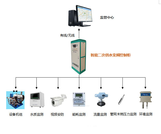 泵房通過(guò)智能二次供水變頻控制柜采集供水設(shè)備機(jī)組傳感器、視頻安防、水質(zhì)監(jiān)測(cè)、能耗監(jiān)測(cè)、流量監(jiān)測(cè)、管網(wǎng)末梢壓力監(jiān)測(cè)、環(huán)境監(jiān)測(cè)等系統(tǒng)輸出的數(shù)據(jù)信息上傳至二次供水泵房遠(yuǎn)程監(jiān)管數(shù)據(jù)中心,并且能夠接收監(jiān)管軟件下發(fā)的指令信息,對(duì)泵房?jī)?nèi)各個(gè)系統(tǒng)進(jìn)行實(shí)時(shí)控制。
